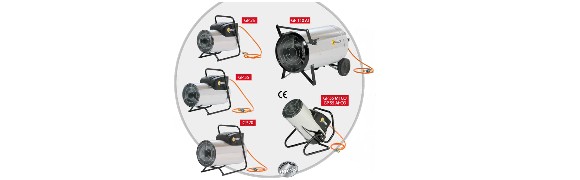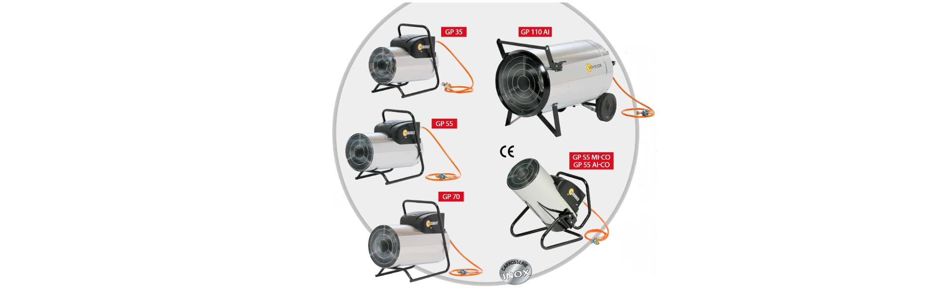 Les GP disposent en série d’une protection électrique par fusible, d’une sécurité de surchauffe, d’un contrôle de flamme permanent, d’une carrosserie double enveloppe, d’une sécurité stop-gaz, de deux grilles de protection (soufflage et aspiration)…NOTA : les GP35MI et AI sont disponibles sur demande avec un châssis orientable identique à celui des GP55MI-CO et AI-CO.