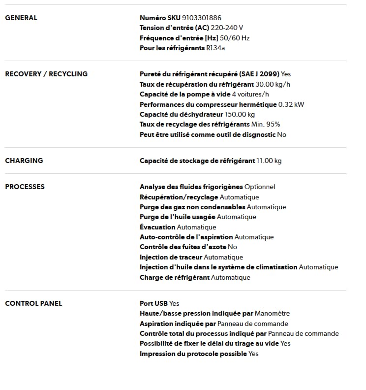 Station d’entretien intégralement automatisée pour les systèmes de climatisation R134a avec fonction de démarrage rapide. Modèle d’entrée de gamme peu onéreux comprenant toutes les fonctions essentielles. Mise à jour pratique du logiciel via un port USB.