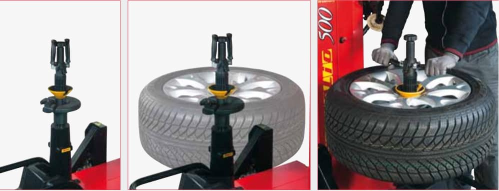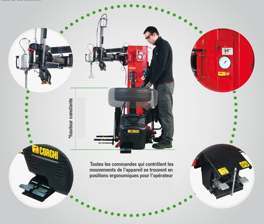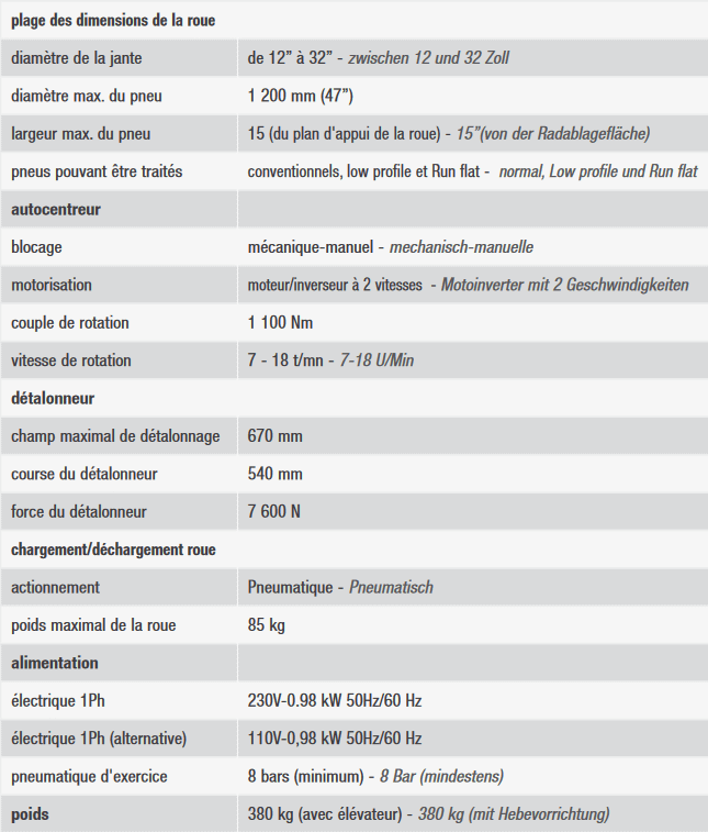 Le plateau autocentreur permet un blocage rapide ainsi qu’un détalonnage des deux flancs sans devoir tourner la roue. La hauteur constante de travail (sauf pour les jantes renversées) a été étudiée pour offrir une parfaite ergonomie aux mouvements de l’opérateur, pour tous les types de roue