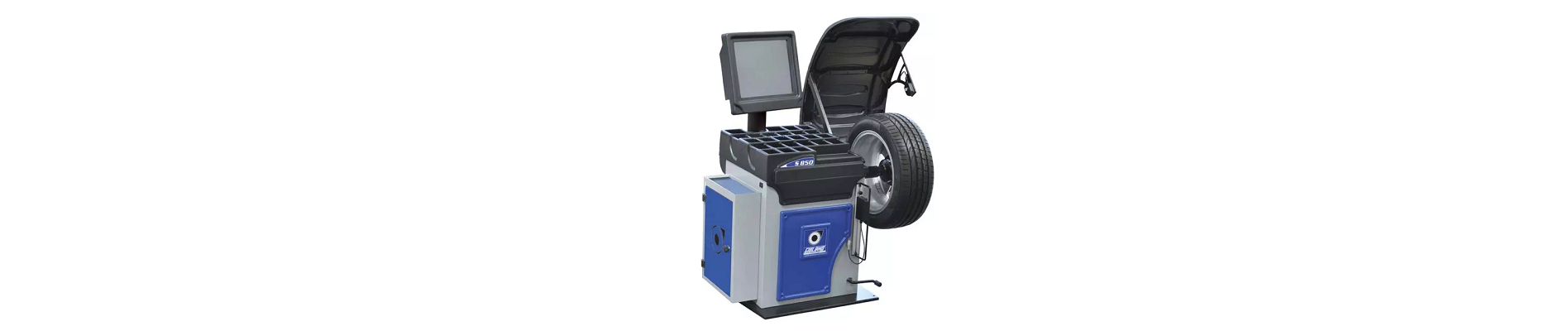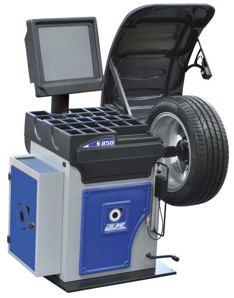 L’Equilibreuse GIULIANO S850 électronique 3D super-automatique digitale avec écran tactile, jauges automatiques, capteurs sonar et dispositif de blocage pneumatique.