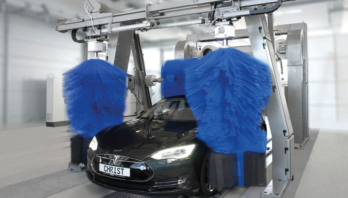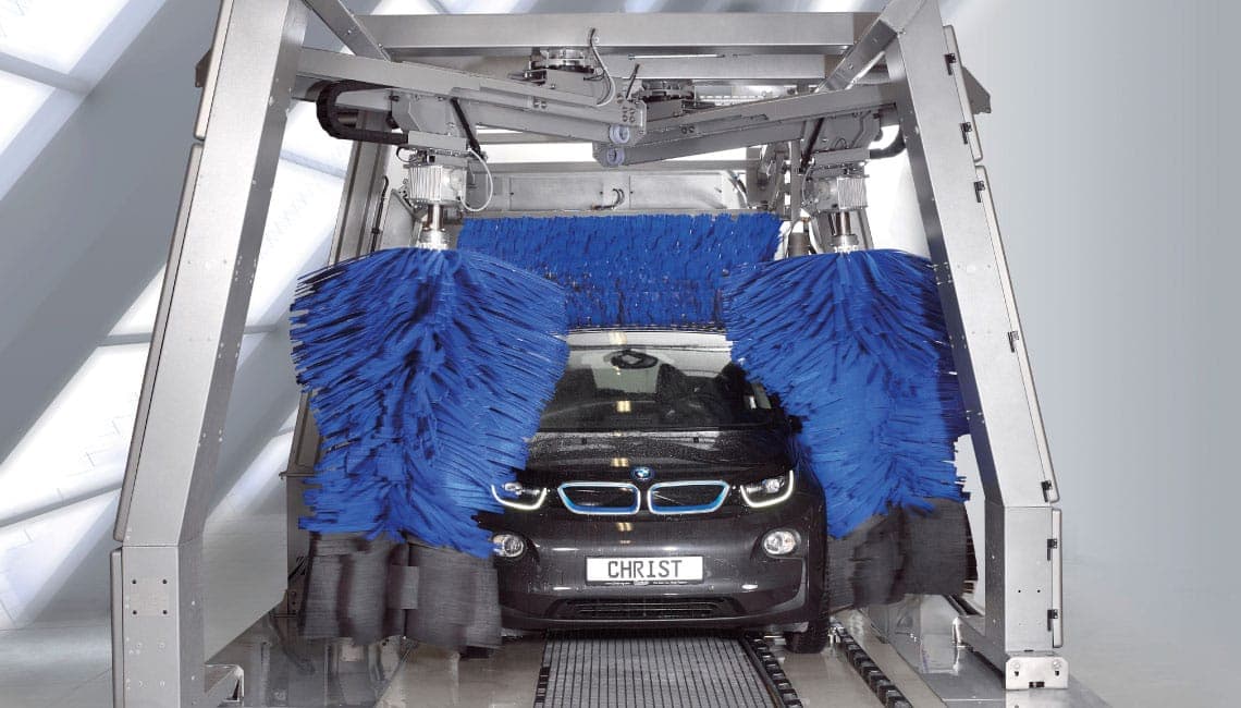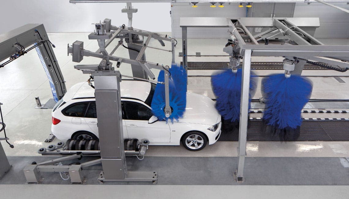 Cours du lavage purement mécanique et pneumatique. Précis et fiable comme une horloge suisse. Deux brosses latérales profilées lavent le véhicule avec un recouvrement médian. Une poursuite intensive a lieu au niveau de l’arrière du véhicule. La brosse latérale s’ouvre à l’avant du véhicule sous l’effet purement mécanique de l’avance du véhicule. La poursuite à l’arrière s’effectue simplement sous l’effet mécanique de l’inclinaison réglable des rails de roulement X-Rail. Pendant le lavage latéral, les rails de roulement sont basculés par voie pneumatique depuis la position de lavage avant à celle de lavage arrière. Une fois le lavage du véhicule terminé, le vérin pneumatique les replace en position de départ.