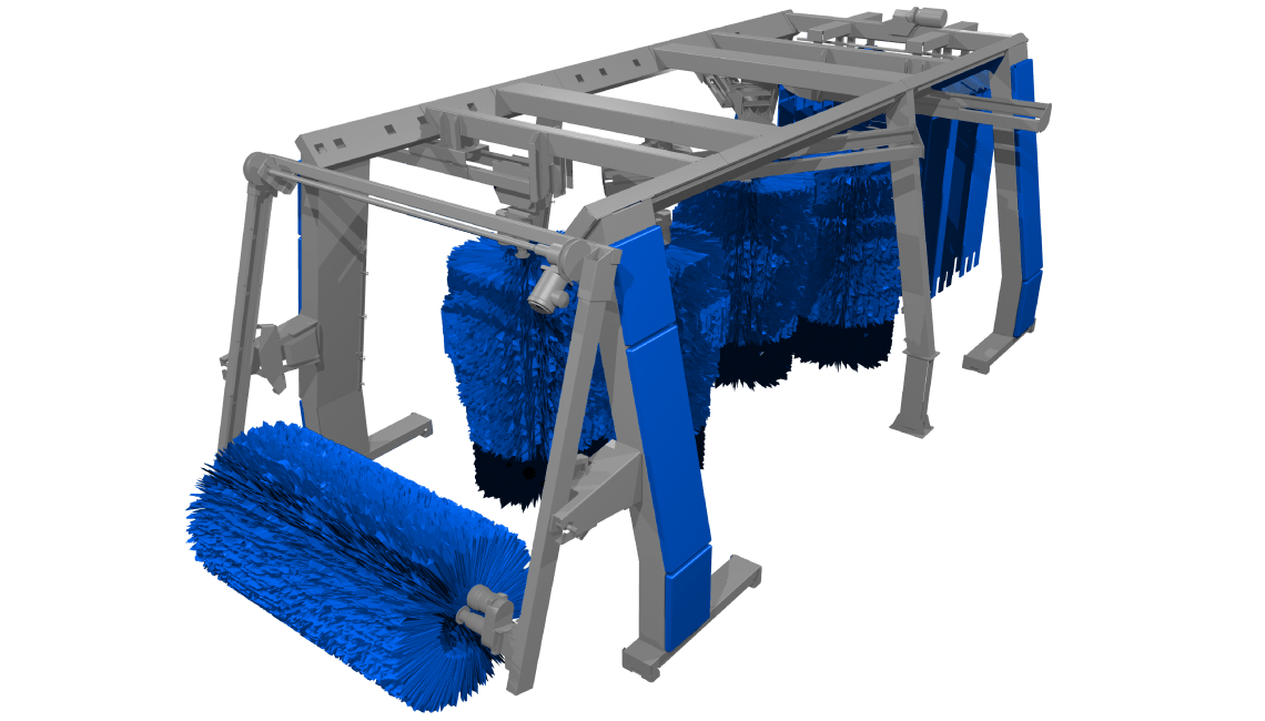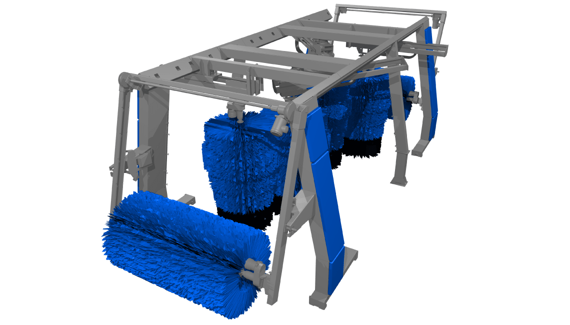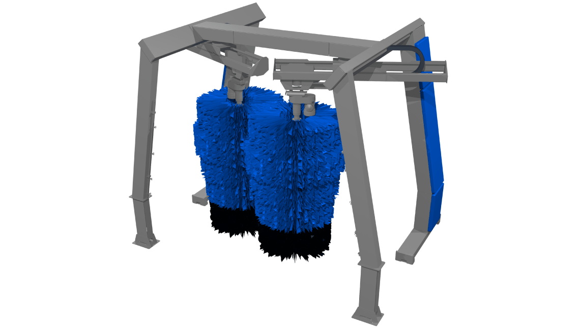 Les 2 brosses latérales montées à l’avant lavent l’avant, les côtés et l’arrière du véhicule. L’écartement des brosses a lieu par mesure de puissance active au niveau de l’entraînement pour brosse électrique au moyen d’un système de vérin pneumatique. Le réglage de la force d’appui s’effectue au moyen d’un système de ressort de traction. Les brosses peuvent être ajustées de manière excentrée par rapport à l’axe de lavage (recouvrement médian avec 2 paires de brosses). L’élément transversal électrique lave les surfaces horizontales et les surfaces latérales supérieures du véhicule. Ce portique peut être monté également en aval du séchage au ventilateur en tant que sécheur avec textile.